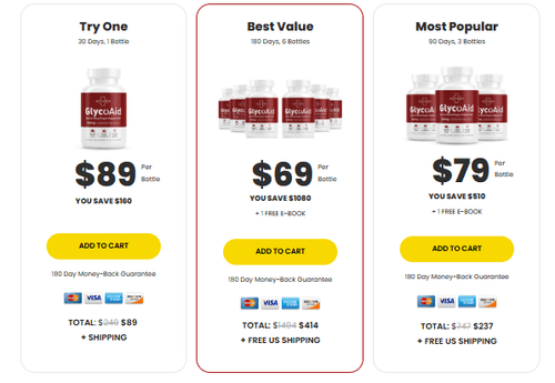 1 Bottle: The fee for a single bottle of GlycoAid Diabetes is $69consistent with bottle, with additional delivery prices.Three Bottles: Opting for the three-bottle bundle offers you areduced price of $59 per bottle, bringing the entire to $177. If youcross for this package, you may also enjoy loose transport and gethold of 2 FREE E-BOOKS with your order.6 Bottles: For the ones looking to stock up, the 6-bottle packagegives the fine price at $49 according to bottle, totaling $294. Thispackage additionally consists of complimentary shipping and the bonusof two FREE E-BOOKS.Place your order proper right here for the nice costs to be had!
